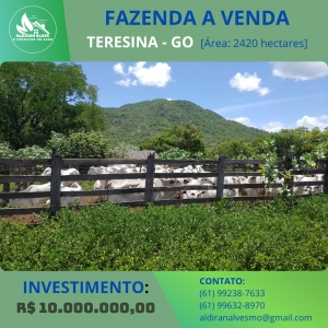 Disponível à venda uma fazenda em Teresina de Goiás 500 alqueires fica a cerca de 4 km afastado da go-118, fazenda está abandonada porém tem alguns benefícios que ainda está preservado casa um pouco de cerca energia elétrica terra de dupla aptidão pode colocar pecuária e pode plantar um pouco boa de água pois passa dois rios na mesma. Àrea dentro de região quilombola porém pode ser aroveitada Escritura de mais de 20 anos do mesmo dono VALOR DE OPORTUNIDADE. 20.000/POR ALQUEIRE PARA MAIS DETALHES Entre em contato 61-996328970 64-933003222 @agroalvesfazendas ALDIRAN ALVES AGRO